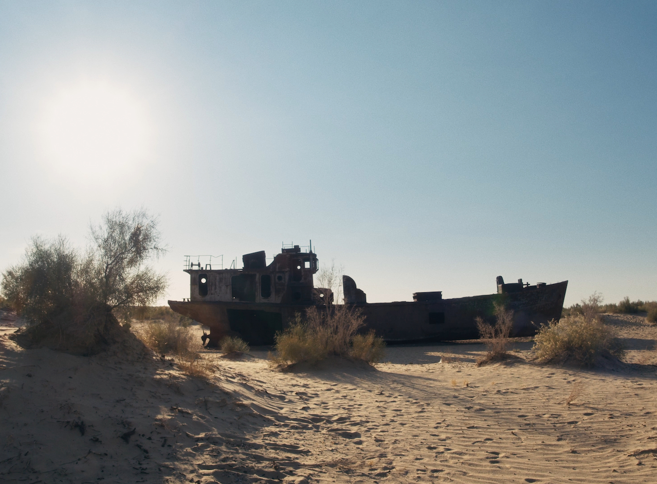A desert landscape, as if from another planet. A few lonely, rusty shipwrecks. Low desert scrub grows around them to hold the sand together during the merciless storms. Aralkum, the Aral Desert, is the bare seabed, the last thing left of the Aral Sea. By weaving together different cinematic textures, this essay re-imagines the dried-up Aral Sea, allowing an old fisherman to set sail one last time.