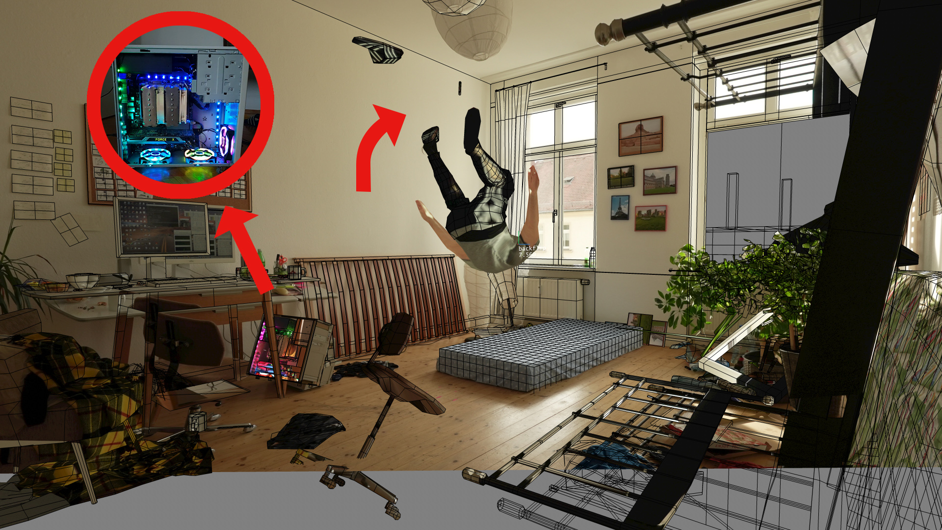 Intentar una voltereta hacia atrás no es seguro. Te puedes romper el cuello, aterrizar de cabeza o caer de mala manera sobre las muñecas. Nada de eso es agradable, así que mi avatar lo hace por mí. Este practica en un procesador de 6 núcleos con la ayuda del Machine Learning. El procesador no es el más nuevo, pero aún puede calcular seis saltos por iteración. Una iteración tarda un minuto, esto es 360 saltos en una hora y 8.640 saltos en un día. Yo mismo no sería capaz de saltar tanto.